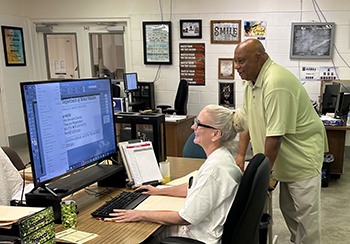 Candra Applegate watches as Susana Toledano works on the Summer 2025 issue of Connections.