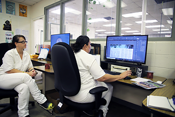 Toledano got her first job at the Hobby Print Shop in 2008 as a clerk in printing operations. She quickly became proficient running all the print shop machines, the presses, cutters, sorters and binders, when she caught the attention of assistant plant manager, Charles Beck. From his glass-walled office, he can see most everything happening on the production floor and get a good’s eye view of inmates working there who may be good candidates for pre-press. Toledano was one of those.